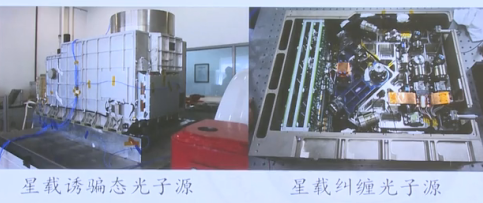 這麼一個光源當時的技術難度也是很大的,因為從來沒有人發過類似的產品上天,我們把這個東西從實驗室的光學平台裏頭,搬到這個上面,一個方面就是光學要很精密,它的穩定性要非常好,再一個各種電子學的設備在裏面,它要抗振動、抗真空,各種環境實驗,所以這個其實也是一個非常難的事情。這是我們整個量子衞星在總裝,就是外殼罩起來之前,所有載荷放在一起的照片,這個已經是最後的產品。