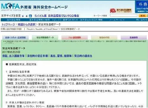 在日本外務省官方網站上,“海外安全”部分中有關中國方面的信息已在5月份更新。