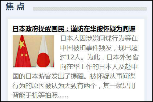 根據日媒14日的報道,日方統計發現,因涉嫌間諜行為,從2015年5月至今,僅獲悉被拘留的日本人就達12人。為此,日本外務省更新了“海外安全”主頁中有關中國方面的信息,提醒赴華日本人需要採取“自我防範措施”。