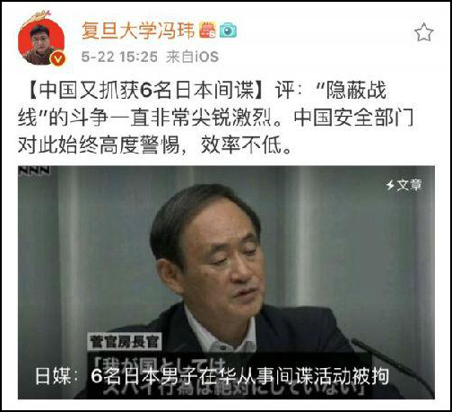 5月22日,當日媒披露“6名日本男子在華從事間諜活動被拘”事件後,復旦大學歷史學系教授、中華日本學會常務理事馮瑋在微博上稱讚道:“‘隱蔽戰線’的鬥爭一直非常尖鋭激烈。中國安全部門對此始終高度警惕,效率不低。”
