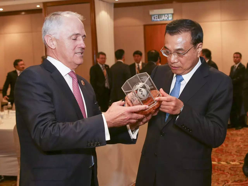 今年是中澳建交45週年,3月23日,李克強總理就將今年首次出訪地選在澳大利亞。當時李克強在堪培拉議會大廈同澳大利亞總理特恩布爾舉行一對一會談時指出,中國將繼續擴大對外開放,以實際行動發出貿易投資自由化便利化、維護現行全球貿易體系的積極信號。當時兩人還互贈了禮物。