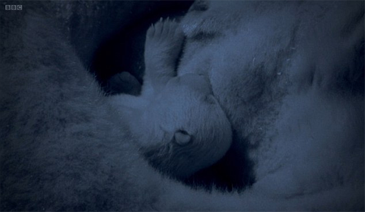 《冰凍星球》中有一個畫面:出生不久的北極熊寶寶躺在母親懷中低聲叫喚。看過的觀眾都相信這是攝像師在嚴寒的氣候條件下拍到的。