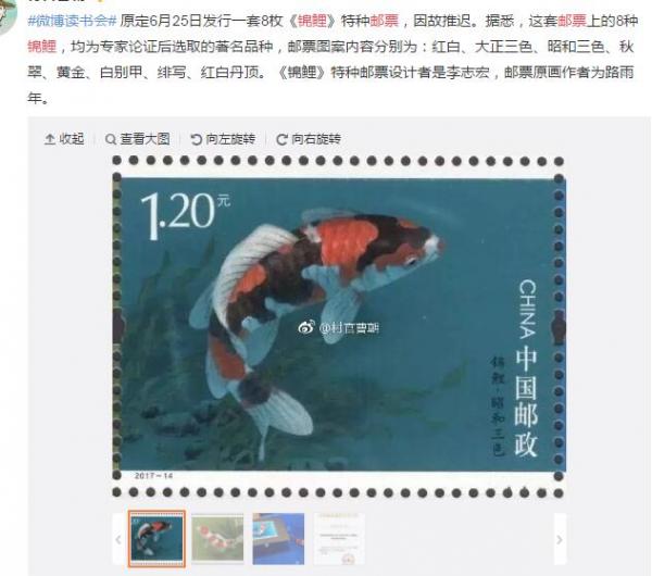 今天網上傳出一條消息,説6月25日發行的《錦鯉》特種郵票,因故推遲。這種臨時措施確實罕見,集郵的朋友們紛紛猜測,“錦鯉最早起源於中國”,但“郵票8條魚全部是日本種”,“尤其是‘大正’‘昭和’這些日本軍國主義色彩的名字引起廣泛不滿。”