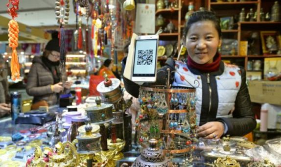 在西藏拉薩八廓街中的一家藏式手工藝品商鋪內,老闆展示她手機上的支付二維碼,顧客可以通過移動支付完成交易。圖|瞭望東方週刊