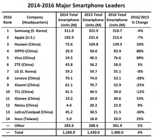 數據顯示,從2014年到2016年,三星和蘋果在智能手機市場占主導地位。這兩家公司在2016年出產了5.26億部智能手機,佔到智能手機市場總數的35%。雖然這兩家公司出貨量超過5億,但市場份額從2015年的39%縮減到35%,同比下降了4%。
