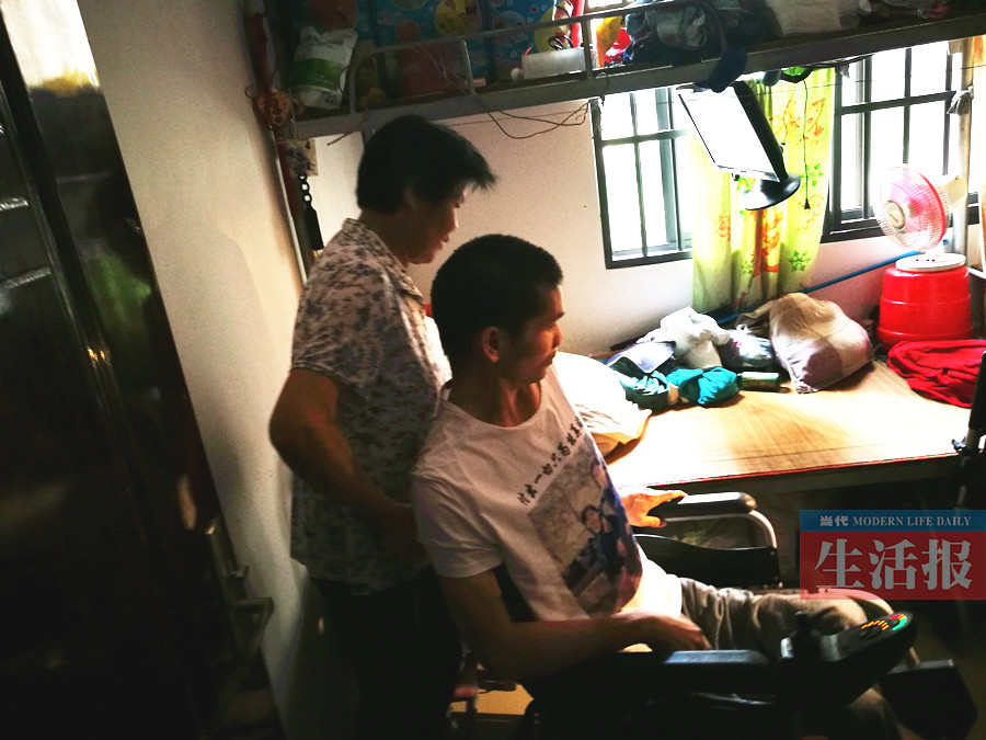 記者進到他家時,陸富正在牀上玩電腦。他無法下牀,需要母親攙扶到輪椅上才能接受記者的採訪。陸富告訴記者,他和父親現在都在享受農村低保,每人每月有150元,自己每月還獲得殘疾人補貼100元。而他租住的廉租房,物業也減免了他一半的租金,物業費也減免了60%。