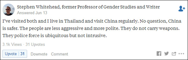 現居泰國清邁的英國人Stephen Whitehead對比了自己曾經生活過的國家中國和泰國,認為中國更加安全。他將此歸功於中國人更友善、禮貌,人們不攜帶武器,警方安保得當。