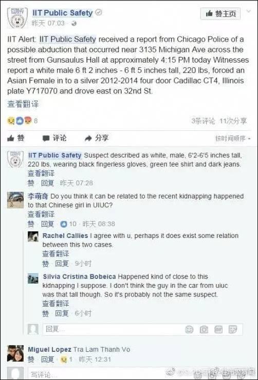 更早前,當地時間6月18日,芝加哥市的伊利諾伊理工學院(IIT)公共安全部門稱,他們接到芝加哥警方的報告稱,17日,大約下午4點15分,在3135 Michigan大街Gunsaulus Hall附近,發生一起疑似綁架案。目擊者描述,一個白人男子將一名亞裔女性強行拉進一輛車內。這使不少網友將該案與章瑩穎案聯繫在一起。