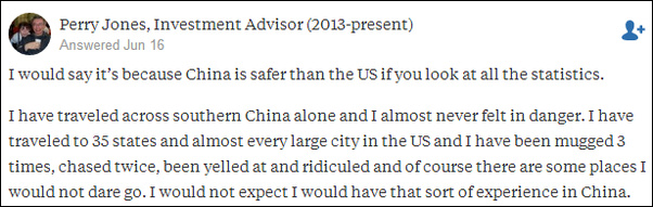 在Quora問題下,網友不僅回答了在中國生活的見聞,還為自己的結論“中國更安全”給出了很多基於不同視角的解讀。