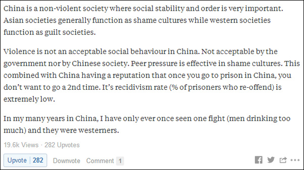 來自加拿大、曾經在中國生活10年的Ray Comeau認為,中國社會是一個十分重視穩定和非暴力的社會,亞洲社會中恥辱文化發揮着很大的作用,而西方社會則不同。在中國,暴力不被政府和社會等任何一方接受,同儕壓力對遏制犯罪非常有利,進過監獄通常會對人們的名聲造成毀滅性打擊,因此中國的再犯罪率很低。
