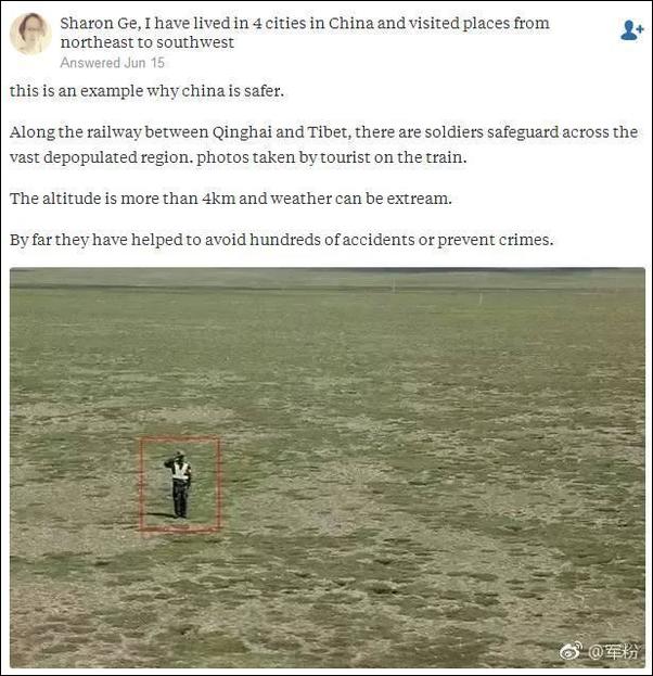 現居瑞典的華人Sharon Ge分享了自己在青藏高原上的一次見聞:在青海和西藏之間的鐵路上,遊客可以看到,儘管海拔已高至4000米,空曠遼闊,荒無人煙且天氣極端,沿途依然有士兵站崗執勤。她認為,正是他們阻止了上百起事故和犯罪的發生。