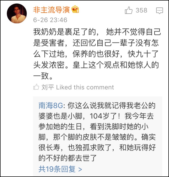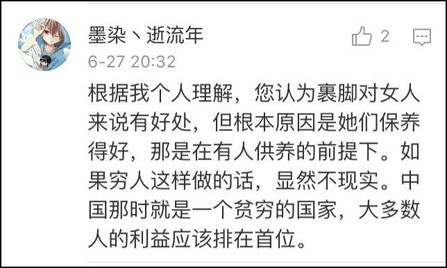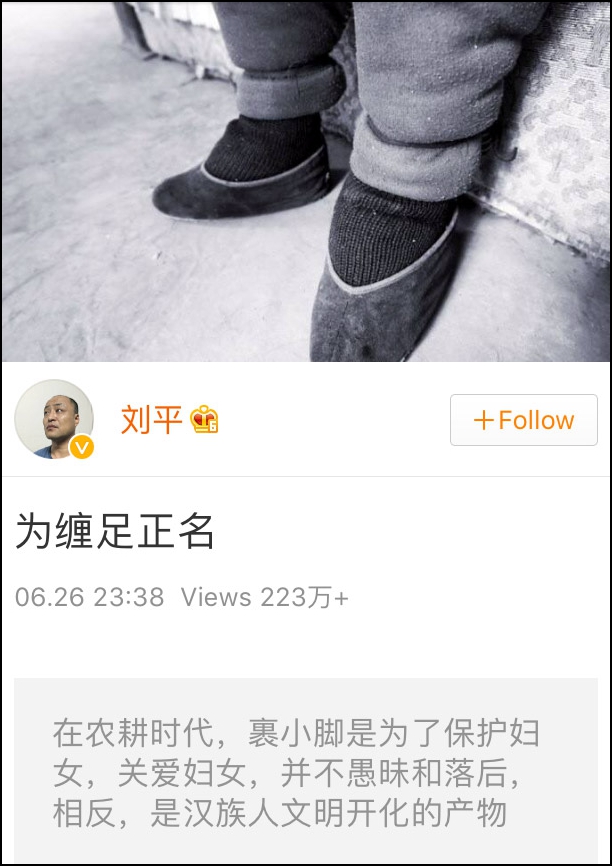 6月26日,微博認證為室內設計師的@劉平發佈了一篇文章,標題很是“嚴正”,叫“為纏足正名”。兩天不到,微博讀者超過200萬,引起網友熱烈討論。