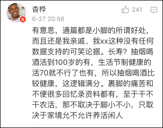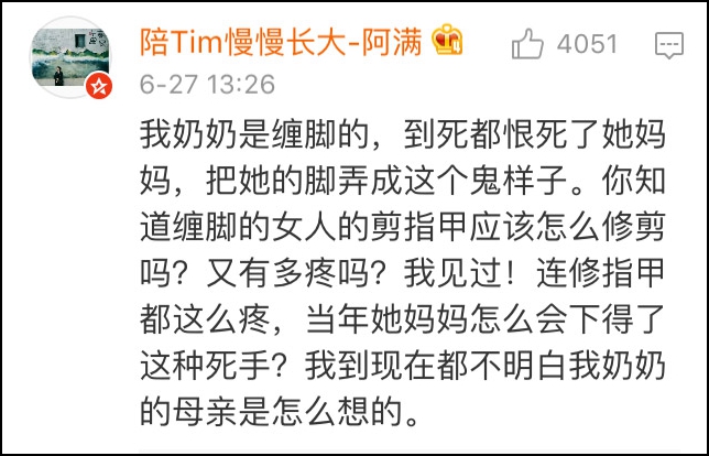 有網友就稱,家中的老人“因為裹腳而壽命更長”,“生活更幸福”: