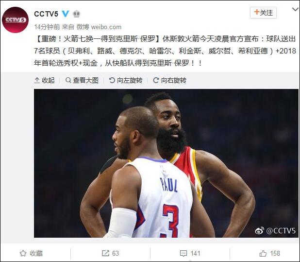 據@CCTV5 29日消息,休斯敦火箭今天凌晨官方宣佈:球隊送出7名球員(貝弗利、路威、德克爾、哈雷爾、利金斯、威爾哲、希利亞德)+2018年首輪選秀權+現金,從快船隊得到克里斯·保羅!!