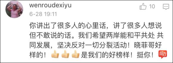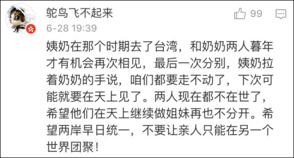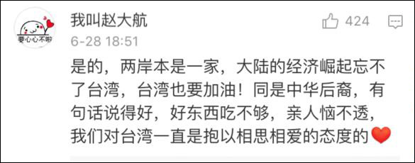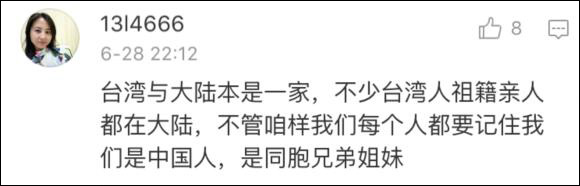 他表示,自己很愛台灣,也不反對台灣人自己家裏的事情,“但是作為一箇中國人,中華民族的後裔,我反對任何形式再次想要分裂祖國、分裂兩岸的做法。因為那段兩岸骨肉分離、痛苦的經歷,摧毀了多少兩岸的家庭。”因為那段兩岸骨肉分離,痛苦的經歷,摧毀了多少兩岸的家庭。雖然現在的年輕人無感,可這就是幾十年前發生的事情,聽着很遠,其實很近。幸福來之不易,請好好珍惜!