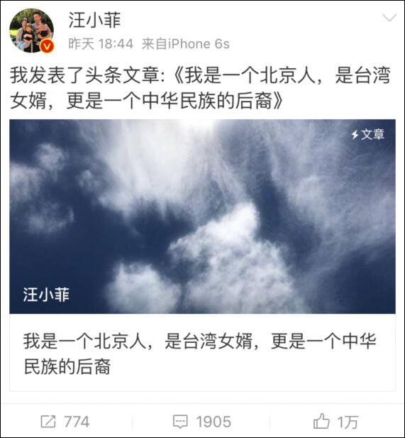 稍後,他再度在微博發佈長文《我是一個北京人,是台灣女婿,更是一箇中華民族的後裔》。