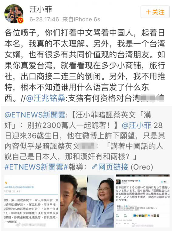 之後,汪小菲話鋒一轉,暗諷台灣地區領導人蔡英文是漢奸,他寫道“都這個年代了,別再打着選舉的名義再愚昧老百姓了,如果一個講着中國話的人説自己是日本人,那和漢奸有何兩樣?”“別拉着兩千三百萬台灣人一起跪着”,隨即引發兩岸熱議。
