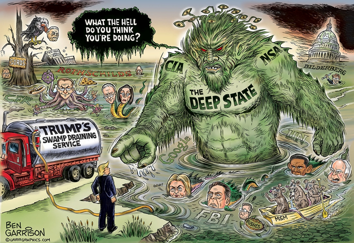 畫面上,日積月累形成的華盛頓官僚腐敗集團(DeepState)被描繪成沼澤中的各種生物,特朗普成為一個揭開腐敗集團黑幕的英雄,在為了美國人民和他們做殊死搏鬥。其中中槍的有參眾兩院議員,布什家族,主流媒體,銀行團,美聯儲,谷歌,中央情報局,聯邦調查局,索羅斯基金會,羅斯柴爾德等等對於中國讀者並不陌生的名字。