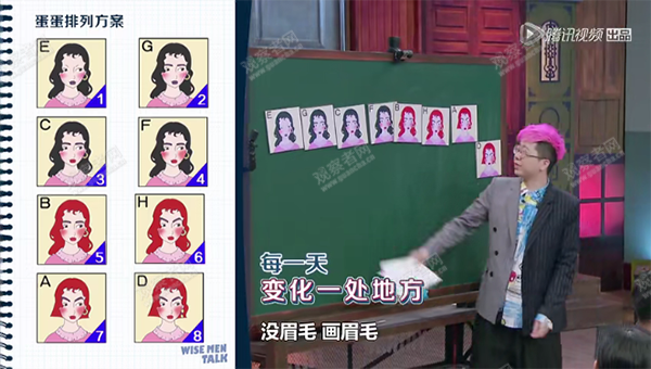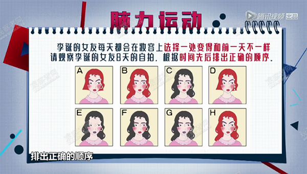 題目2:主持人李誕的女友每天都會在妝容上選擇一處變得和前一天不一樣。請觀察李誕女友8天的自拍,根據時間先後拍出正確的順序。