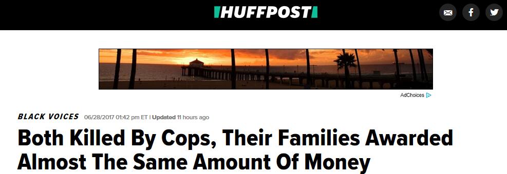 赫芬頓郵報報道截圖:兩個人都被警車射殺,他們的家人獲得了相同的賠償金