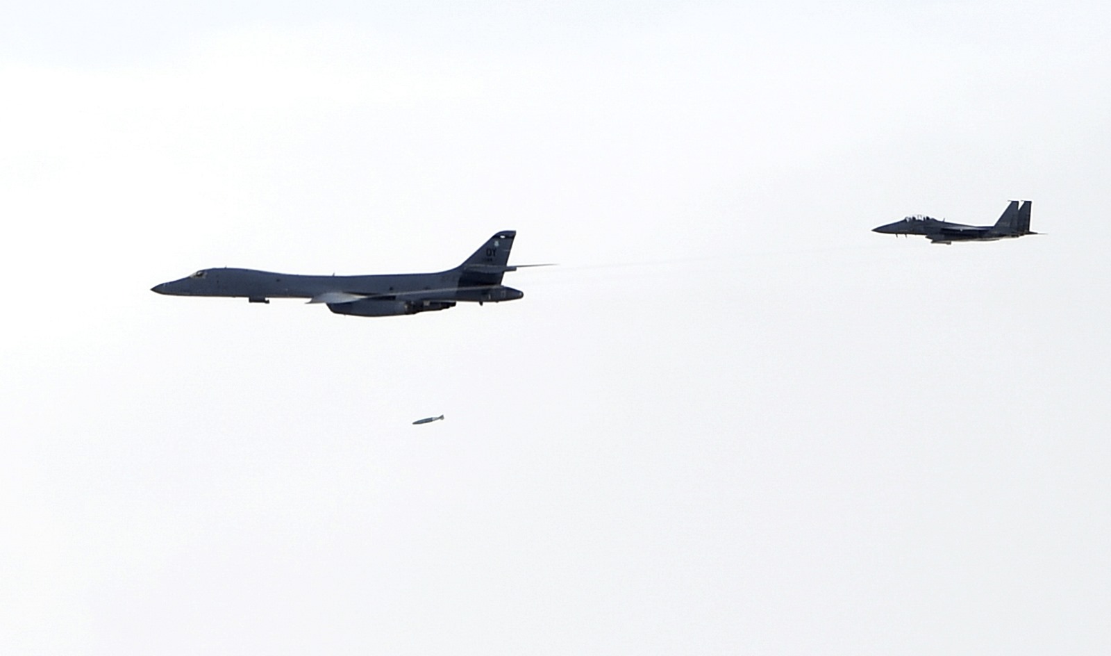 美軍2架B-1B戰略轟炸機在靶場各投下一枚907公斤級的GBU-31制導炸彈,模擬攻擊、摧毀經過加固的彈道導彈基地。另外4架美韓戰機則進行精確打擊演練,模擬摧毀地下指揮部、彈藥庫等隱藏設施。這是朝鮮戰爭停戰以來,美軍轟炸機首次在朝鮮半島投擲實彈。