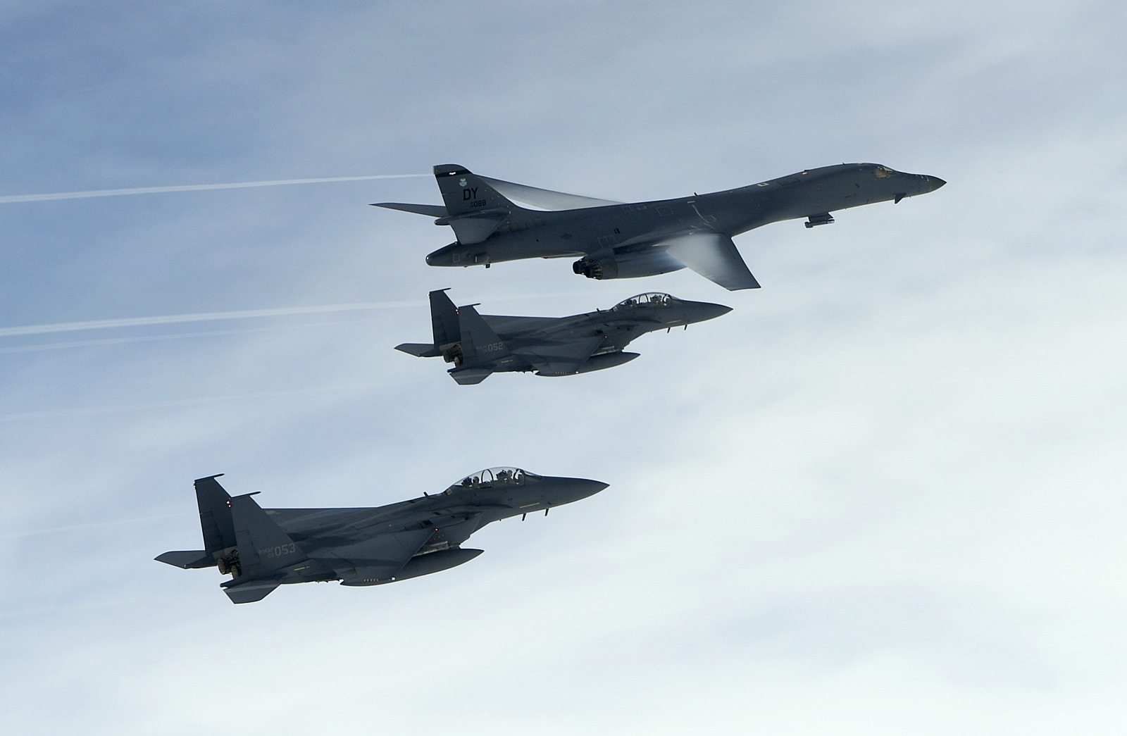 韓國空軍的F-15K戰機為美軍B-1B戰略轟炸機共同前往靶場