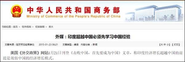 但實際上,據商務部網站消息,早在2015年初,《外交政策》網站又刊登了文章《擊敗中國,首先要成為中國》,稱印度經濟增長超越中國的前提,是效仿中國的經濟增長模式。