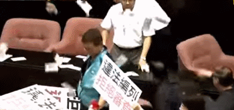前文再續,書接上回。昨日“女將”上陣不夠,今日(14日),台灣當局“立法院”內全員開打:摔椅子、丟水球、撒假鈔、拽領子……可謂花樣百出。