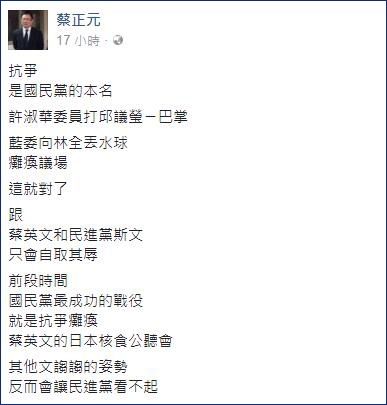 蔡正元貼文稱,許淑華打邱議瑩一巴掌,“藍委”向林全丟水球,癱瘓議場,這就對了。跟蔡英文和民進黨斯文,只會自取其辱。