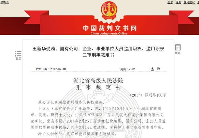 湖北省荊州市中級人民法院一審以王新華犯受賄罪,判處其有期徒刑14年,犯國有公司人員濫用職權罪,判處其有期徒刑5年,決定執行有期徒刑17年,並處沒收財產人民幣一百萬元。王新華不服上訴,今年7月,湖北高院經過審理駁回王新華的上訴,維持原判。