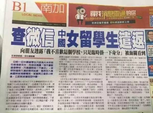 2016年2月26日,另一位中國女留學生只因為大半年前在微信聊天中,向朋友透露“我不喜歡這個學校,只是臨時掛一下身份”,沒想到這段久遠的聊天紀錄,竟然在入境美國時被海關看到,被盤問3個多小時後,立即就被遣返回中國。