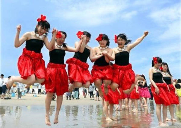 香港東網7月17日報道,福島縣盤城市的薄磯海水浴場,原是當地最受歡迎的海水浴場之一,該浴場上週六舉行災後首次的夏季開幕禮,約1000人齊集沙灘嬉水,大批女高中生穿鮮豔泳裝表演,