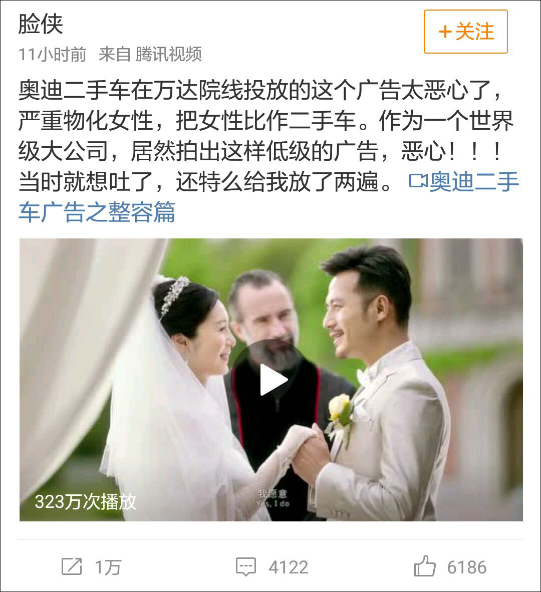 【觀察者網綜合報道】近日,一則奧迪二手車廣告犯了眾怒。7月17日,網友“@臉俠”發微博稱,在影院中看到的這段奧迪二手車的廣告把自己噁心到了……