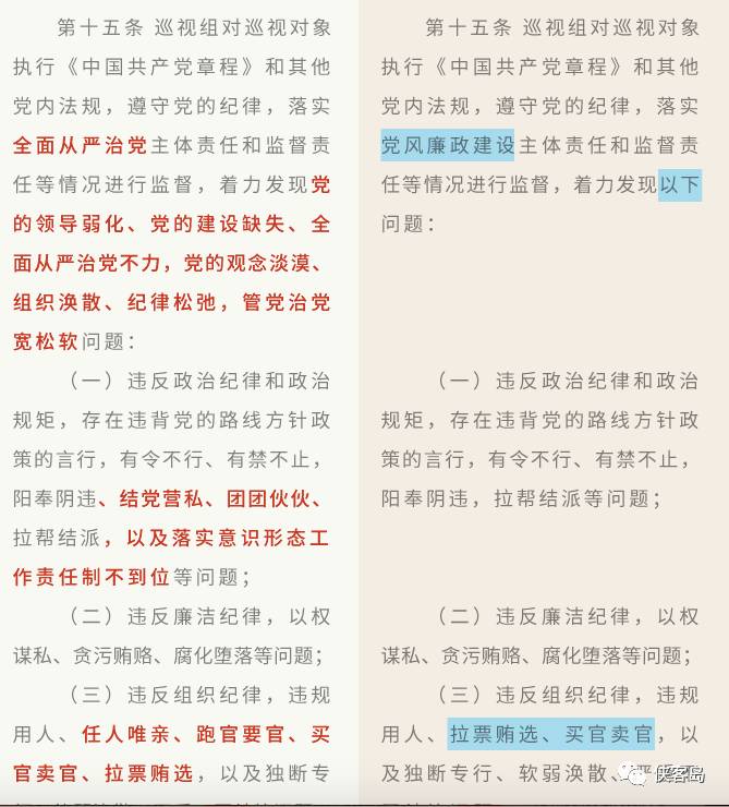 跟上一次相比,此次修訂,最引人注目的內容在兩個方面:一,確定了“在一屆任期內對所管理的地方、部門、企事業單位黨組織全面巡視”的頻率和範圍,同時規定中央的部門、地方市縣一級,也都要對所轄範圍進行巡視、巡察;二,巡視的內容,提綱挈領指出首要的是“全面從嚴治黨”相關,以此為統攝,下列政治規矩和紀律、廉潔紀律、組織紀律、羣眾紀律等,與《黨內監督條例》相吻合。