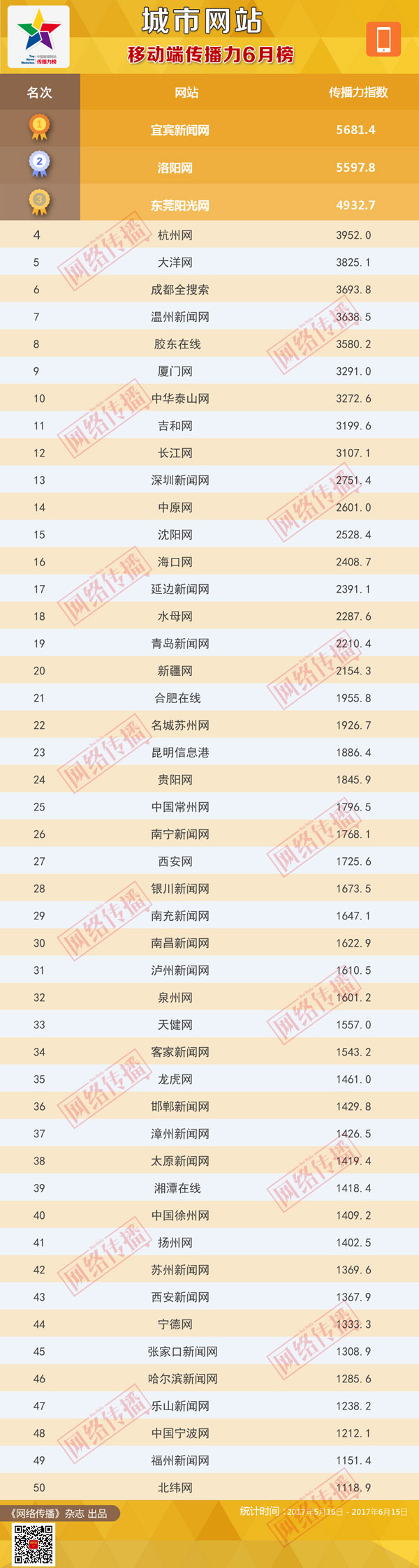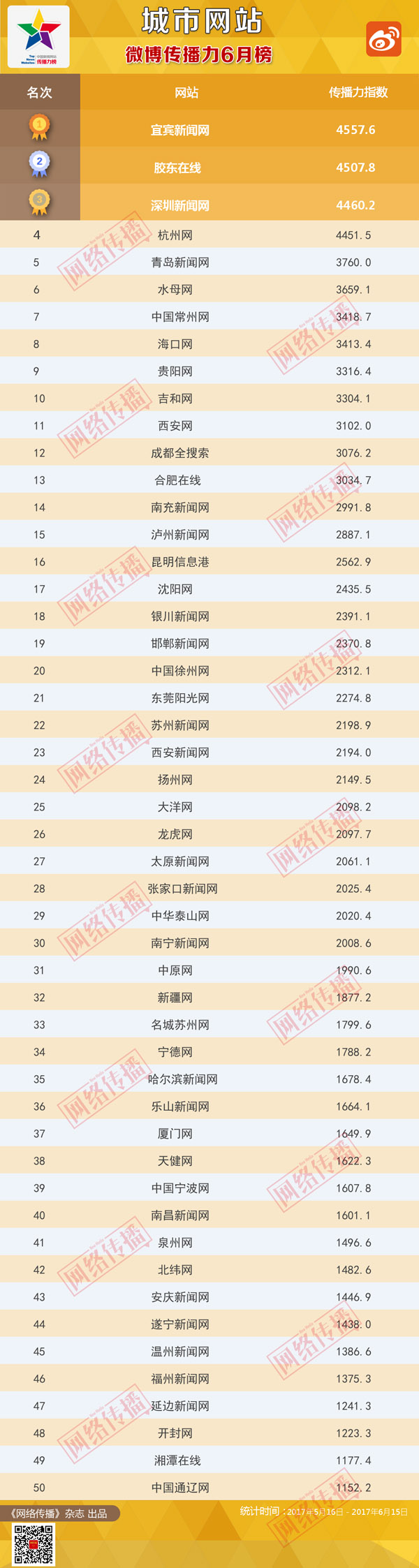 中央網信辦《網絡傳播》雜誌傾力打造的“城市網站傳播力2017年6月榜”今日發佈。