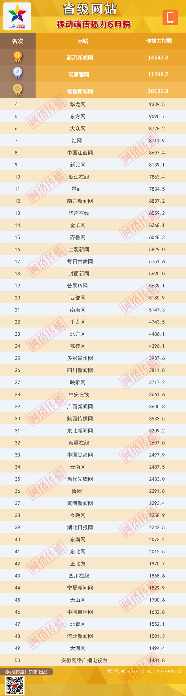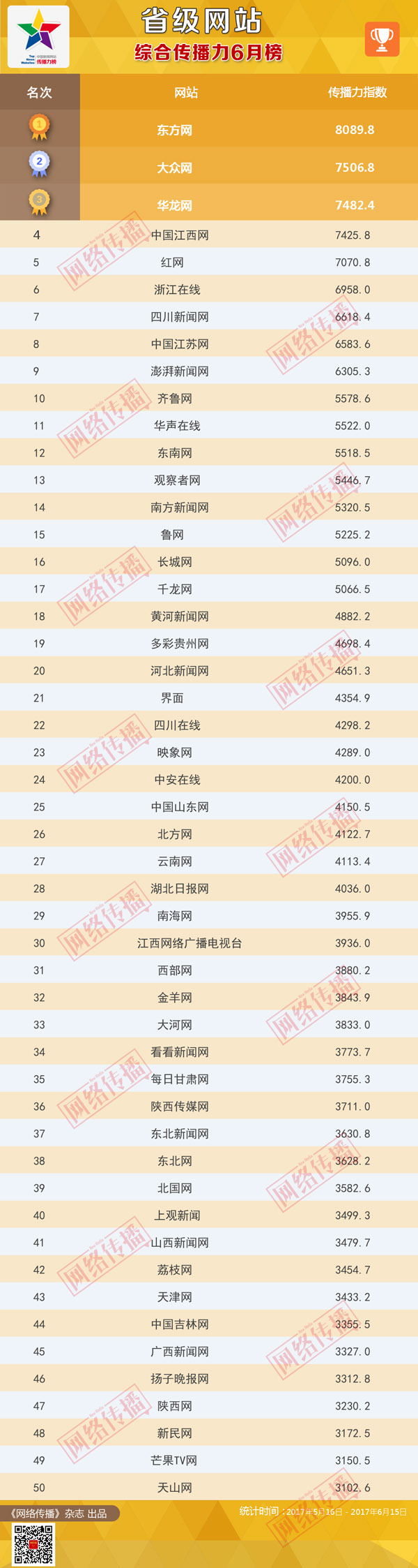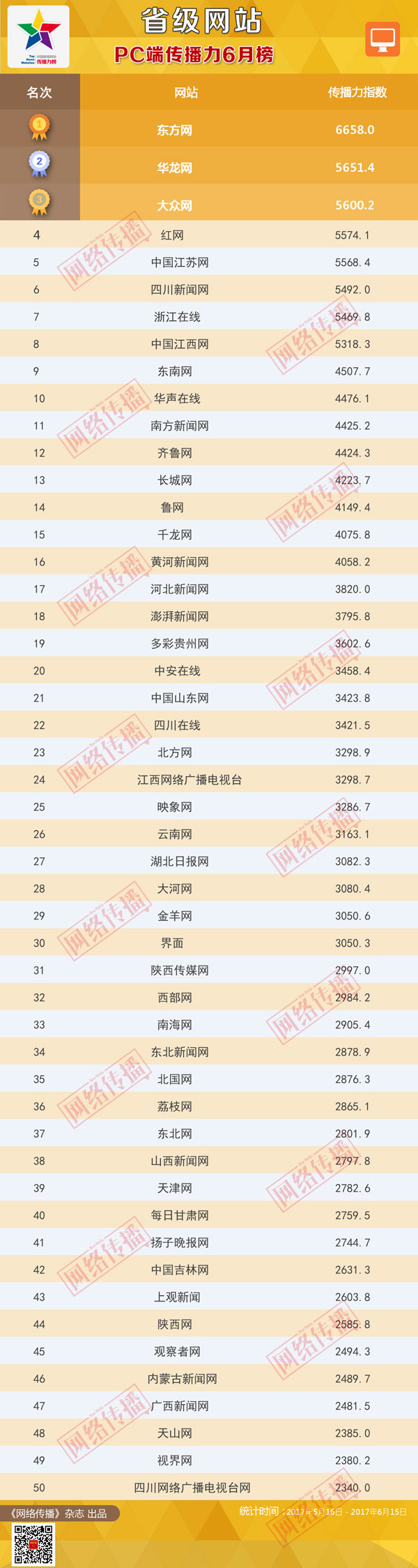 中央網信辦《網絡傳播》雜誌傾力打造的“省級網站傳播力2017年6月榜”今日發佈。