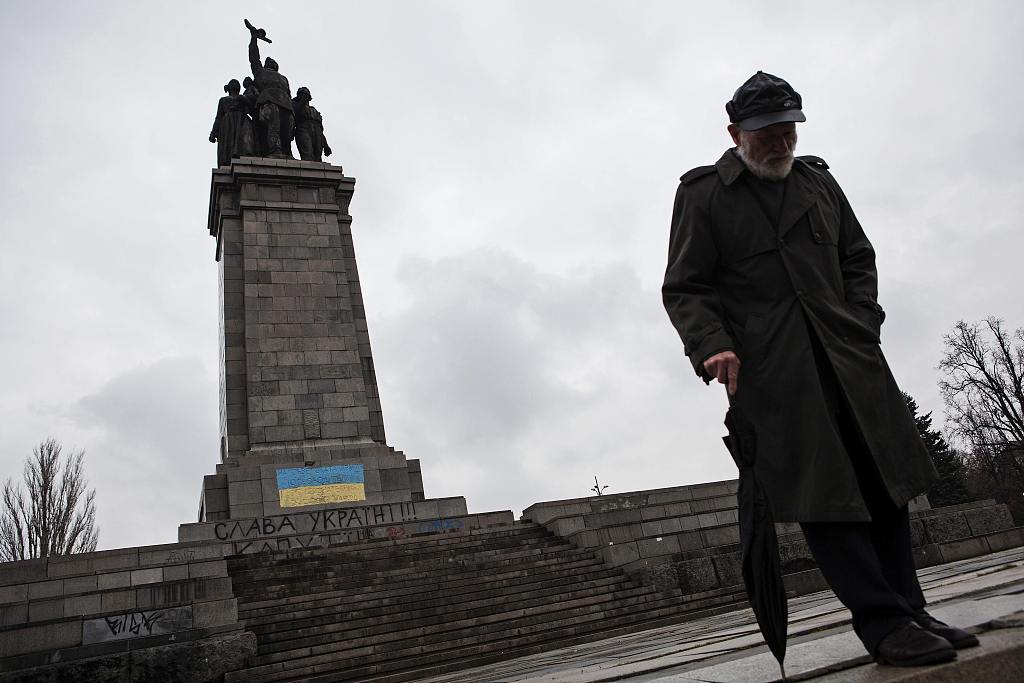 在烏克蘭危機爆發之後,保加利亞一座紅軍紀念碑被塗上了烏克蘭國旗的顏色@視覺中國
