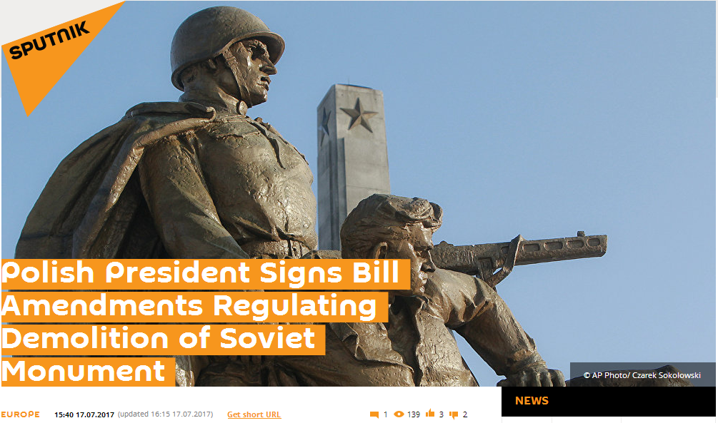 該案全名《禁止在公共建築、設施和場所名稱中宣傳共產主義或其他極權主義法》,波蘭議會下議院於今年6月22日,蘇聯衞國戰爭爆發日通過。根據該修正案,將拆除包括紅軍紀念碑在內的蘇聯時期紀念碑。據波蘭民族紀念研究所計算,將有約230座紅軍紀念碑因該法律被拆除。而目前波蘭境內約有500座紅軍紀念碑。