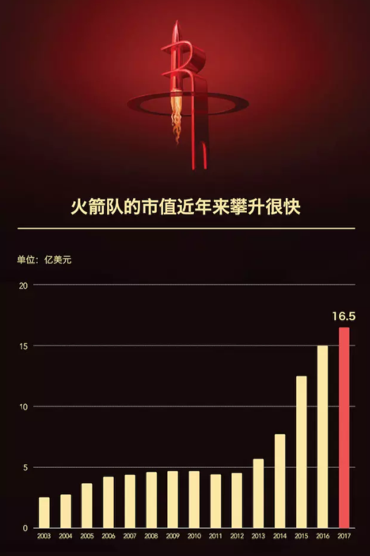 另據好奇心日報7月18日報道,《福布斯》今年2月對火箭的估值為16.5億美元,超過NBA球隊平均13.6億的市值。而且火箭財務健康,年收入2.44億美元,營業利潤則達到了6270萬美元。從近年火箭的市值表現來看,也可以發現這個數據躥得很猛。根據《福布斯》的統計,2017年NBA球隊的平均市值是五年前的3.5倍。在這個數據上,火箭的3.64倍同樣超過了平均。