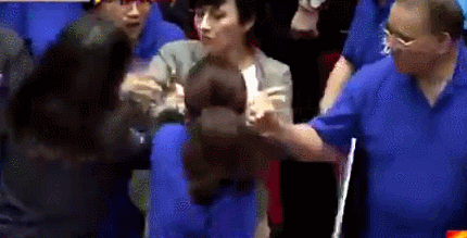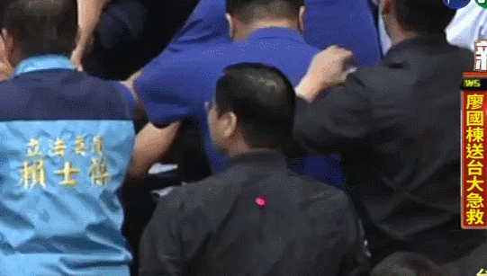 “綠委“質詢時,“藍委”突然衝撞質詢台,兵分兩路想繞上主席台,過程中發生嚴重推擠,多人被撞倒在地。