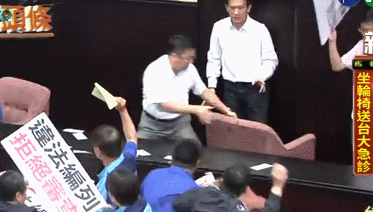 一片混亂中,藍綠“立委”都有被擊中,甚至還有“立委”當場穿起雨衣,場面相當滑稽,就算是天花板燈具也無法倖免,搖搖欲墜。