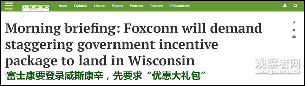 美媒:富士康去美國威斯康辛,先要求優惠大禮包
