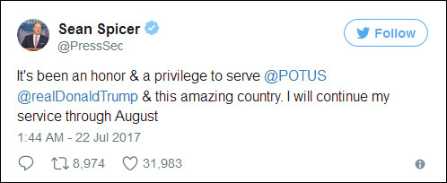 在斯派塞宣佈辭職後,他發推特表示自己很榮幸為總統和國家服務,還説自己將會在8月過後正式離職。