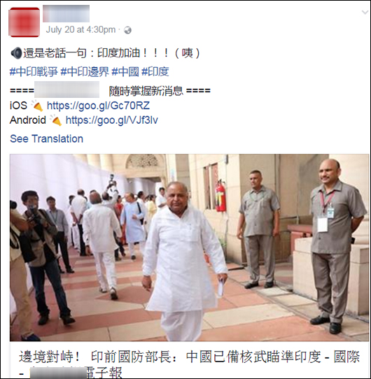 據海外網7月21日報道,台灣某深綠媒體20日在分享一則關於中印局勢的報道時留言:“還是老話一句:印度加油!!!”