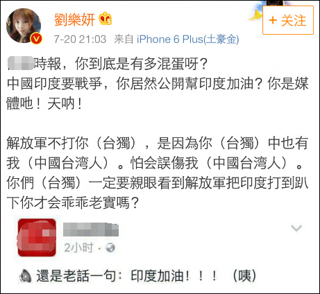 這引起台灣女星劉樂妍對該媒體立場的質疑。20日她在微博炮轟:“你居然公開幫印度加油?你是媒體誒!”