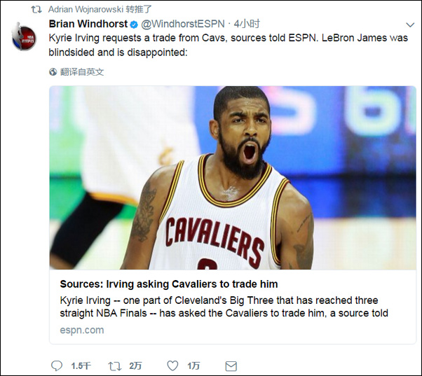 據虎撲體育7月22日報道,NBA記者Brian Windhorst報道稱,據聯盟消息人士透露,全明星後衞凱里-歐文在上週與騎士的一次會面中要求球隊將他交易走。