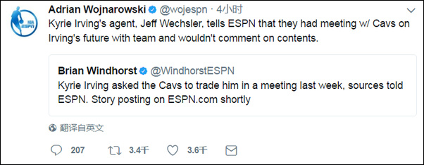 Brian Windhorst報道此事和Woj確認消息的推特截圖