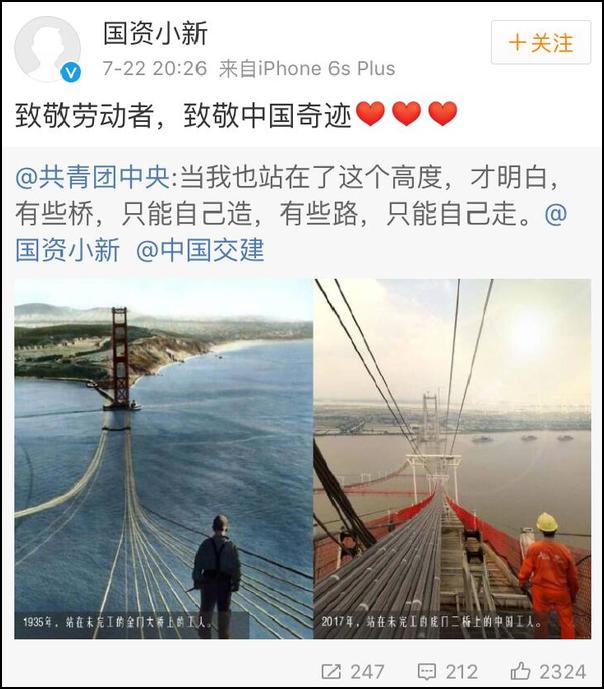 左圖是1935年未完工的美國金門大橋上的工人;右圖是2017年未完工的中國虎門二橋上的工人。