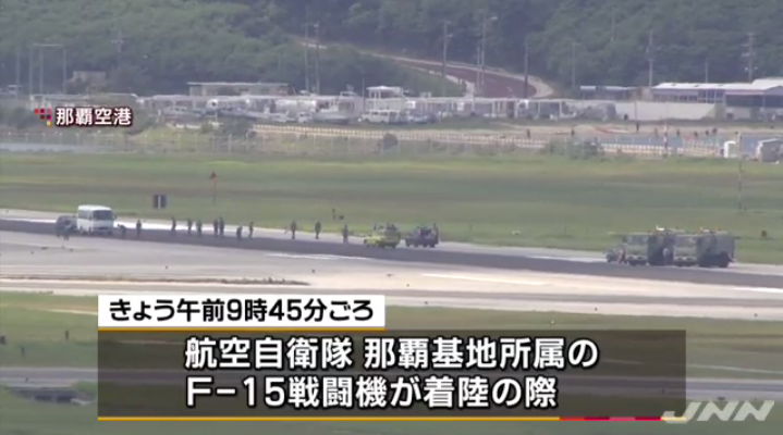 朝日電視台稱,滑行道上遺留不少疑似玻璃碎片的物體。約20名工作人員正在收集碎片,一旁約有10架民航班機等待起飛。朝日電視台援引防衞省消息人士稱,疑似空自F-15戰鬥機前起落架指示燈在起飛時破碎。《朝日新聞》表示,涉事戰鬥機原定起飛前往沖繩附近海域訓練。