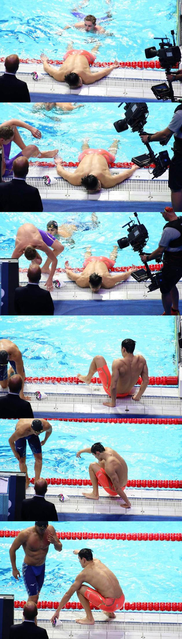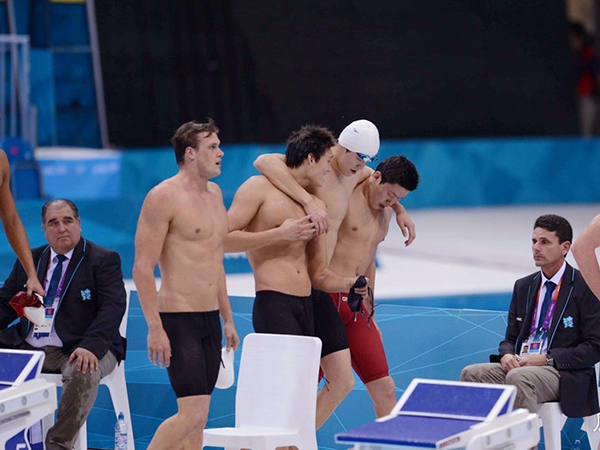 在2012年倫敦奧運會男子4x200米自由泳接力決賽上,孫楊領銜的中國隊奪得銅牌,創造了中國游泳隊男子接力的歷史。賽後,作為中國最後一棒的孫楊,由於在比賽中拼得太兇,同樣是累的癱倒在了泳池邊上。當其他選手在他身邊經過的時候,他甚至沒有力氣挪動自己的身體。最後面是在隊友的攙扶下才離開了比賽場地。